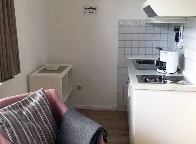 Unsere gemütlichen ca. 21 qm großen Einraum-Appartements sind besonders beliebt bei Alleinreisenden und für den kuscheligen Urlaub zu Zweit. Küchenzeile,Dusche/WC, Wohnung 7 mit Balkon und seitlichem Meerblick.